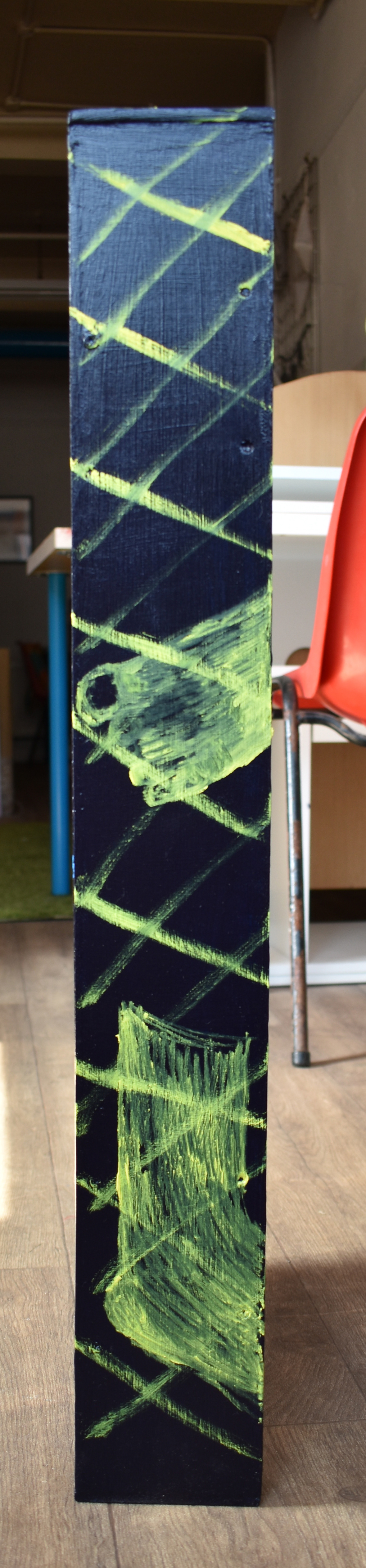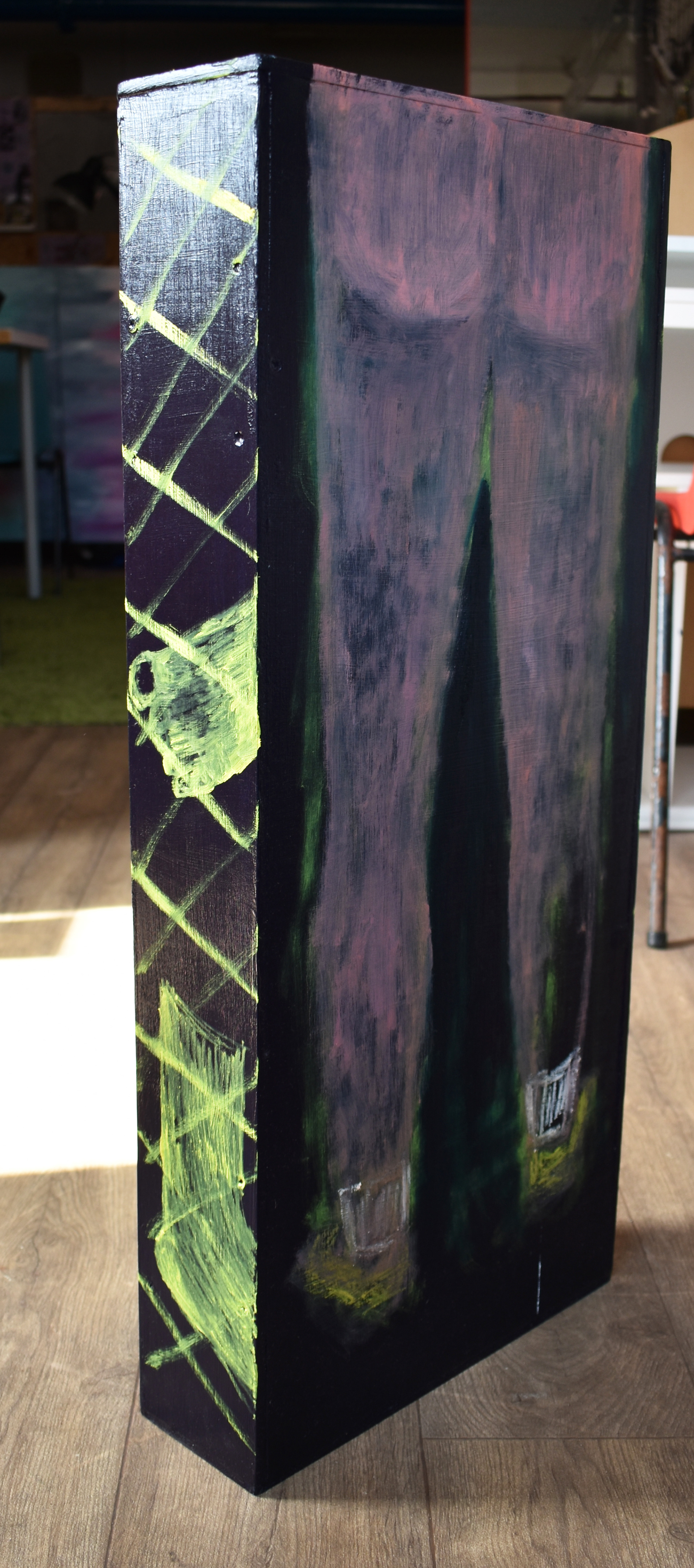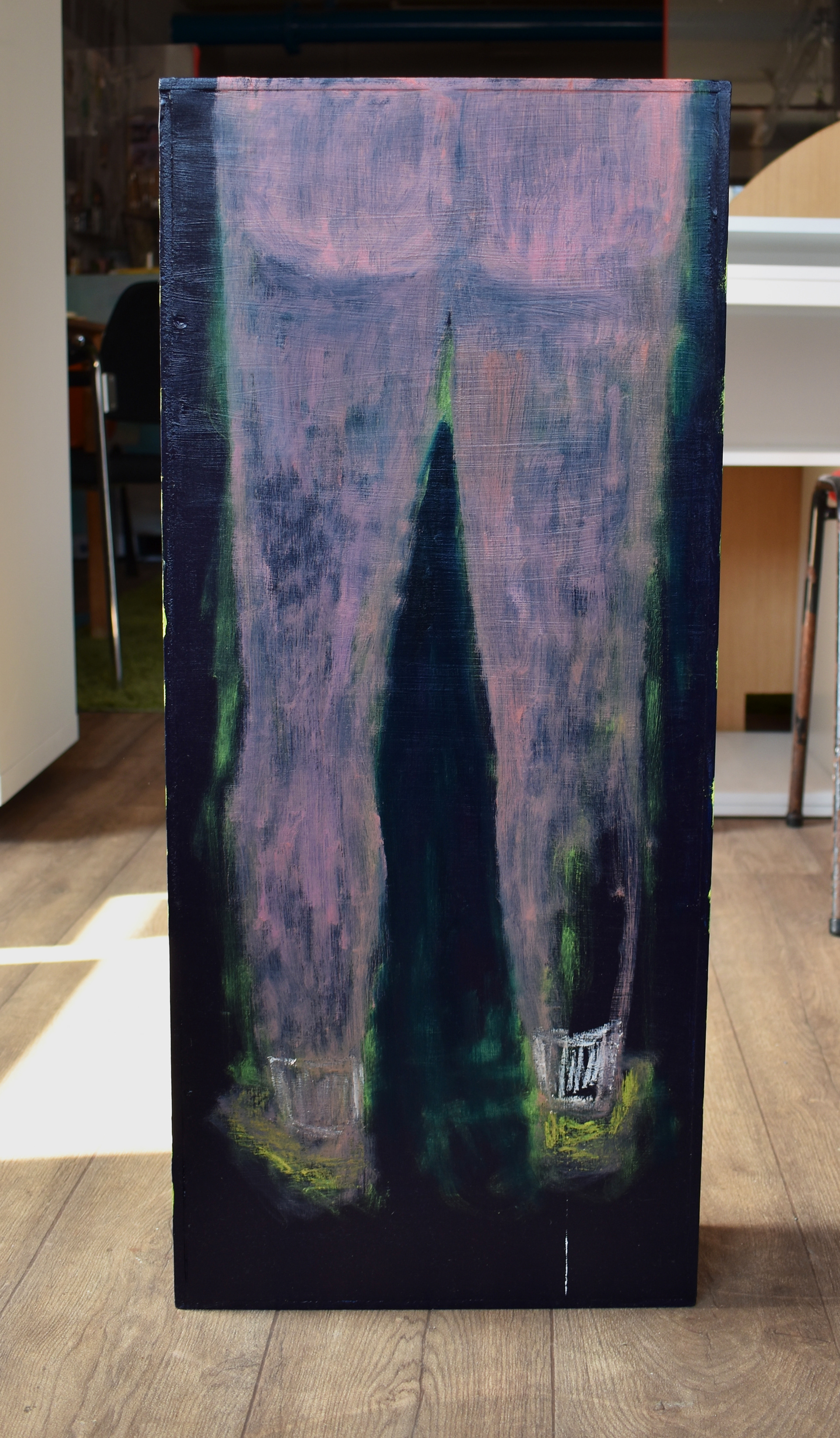 'Pissing in the rain, mind that fish', 2023, oil paint on wooden box, 72x32x10cm
