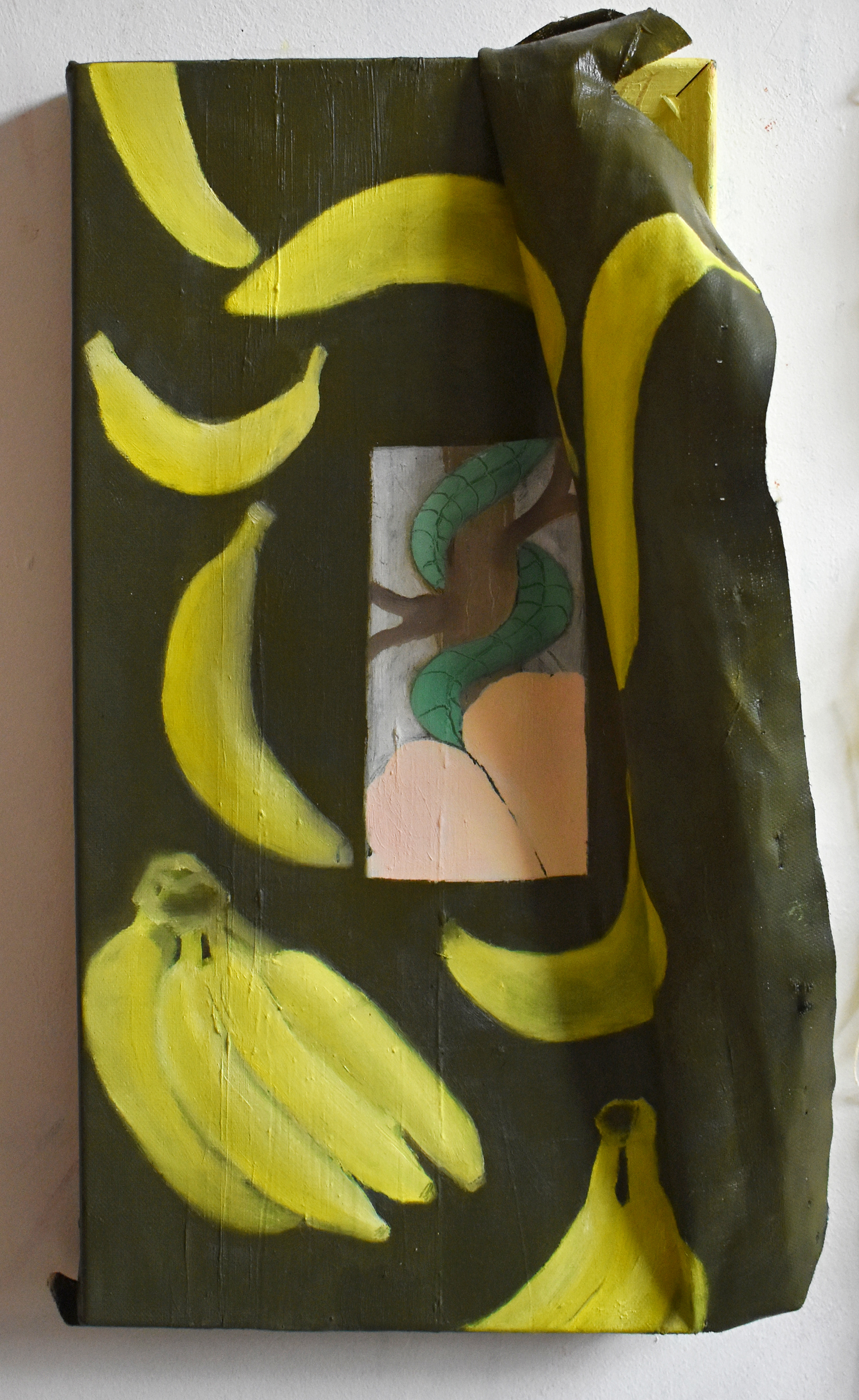 'Not Drinking Water', oil on canvas and oil on found paper bag, 2023